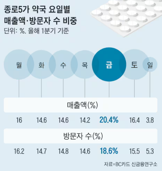 올해 1분기 종로5가 약국 매출금액 비중이 가장 큰 날은 금요일(20.4%)이다. 일요일(3.8%)이 가장 적고 나머지 평일(월~목)과 토요일은 15% 내외로 조사됐다.