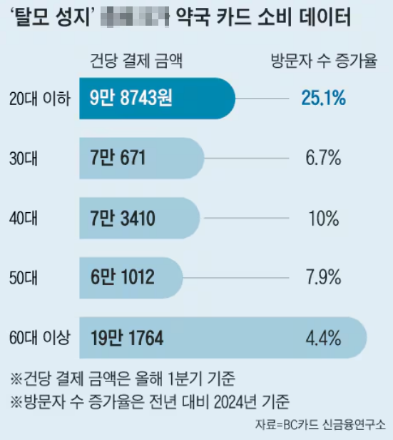 다만 이 분석 자료는 탈모 치료를 위한 결제 건을 따로 분리하지는 않았다. BC카드 관계자는 “탈모약 전문으로 유명한 종로5가 일대 약국을 선별해 뽑은 결제 데이터이기 때문에 탈모 치료 관련 소비로 추정할 수 있다”며 “건당 결제금액도 통상적인 약값보다 비싼데 한 번에 탈모약을 처방 받았기 때문으로 추정된다”고 했다.