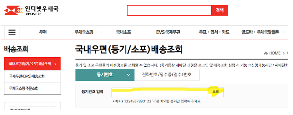 - 등기번호를 모를 경우, 전화번호나 우편물 영수증에 있는 번호를 입력하여 조회를 시도할 수 있습니다.