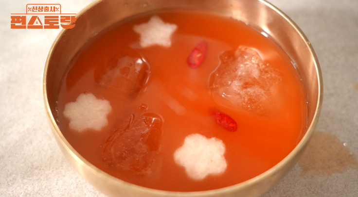 4. 김치냉국에 배, 홍고추, 얼음을 넣으면 완성!