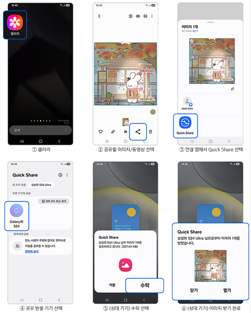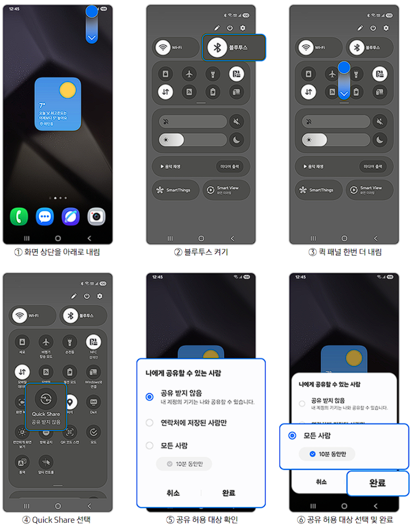 • 화면 상단을 아래로 내림 > 한번 더 내려 퀵패널 확장 > Quick Share 누름 > 공유 허용 대상 확인 > 공유 허용 대상 선택