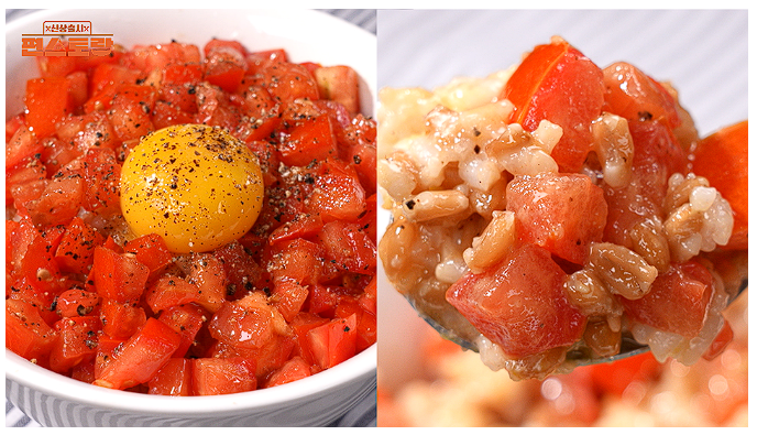 2. 그릇에 파로밥을 담고 1의 토마토와 2)의 달걀노른자를 올리고 흑후추를 뿌린다.