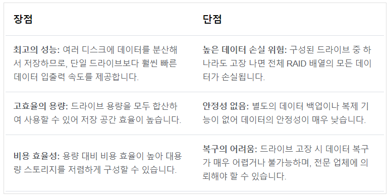 - 낮은 안정성: RAID 0은 데이터 복제나 오류 복구 기능이 없기 때문에, 디스크 하나라도 고장 나면 모든 데이터를 잃게 됩니다.