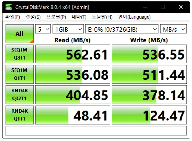 또한, 하드웨어 RAID1 상태에서 나타나는 단일 드라이브는 CrystalDiskInfo와 같은 SMART 프로그램으로 점검할 수 없어, 시스템의 건강 상태를 전혀 알 수 없습니다. JBOD로 전환할 때만 개별적으로 디스크 건강을 확인/테스트할 수 있습니다.